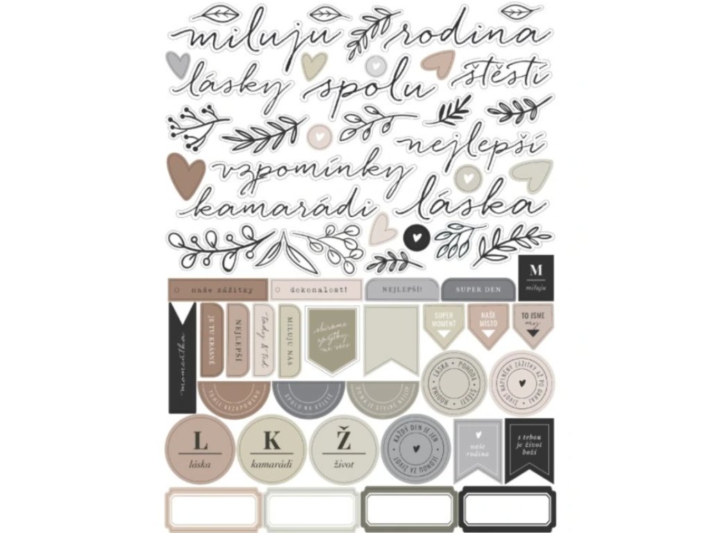 České samolepky obsahují spoustu nápisů a textových štítků pro dekorování kalendářů, fotoalb a deníků.