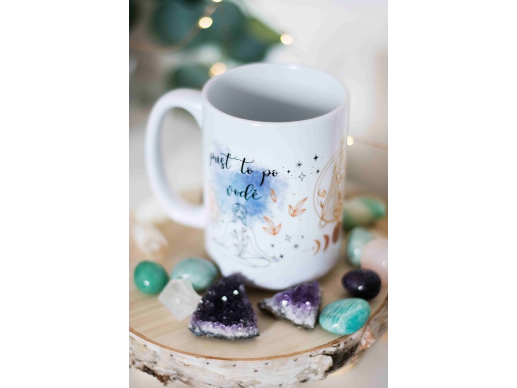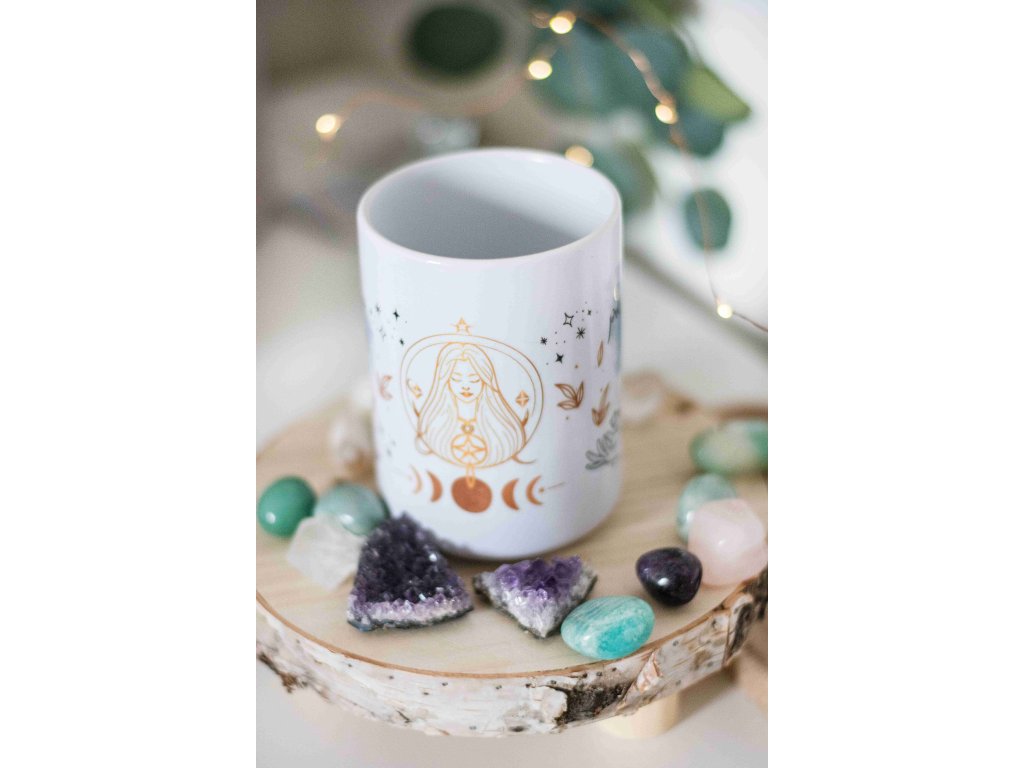 Zvu vás do světa pohody s mým originálním hrnečkem o objemu 450 ml, který nese poselství klidu a uvolnění. Na jeho povrchu najdete krásnou bohyni, která symbolizuje přijetí a intuici, obklopenou esoterickými výjevy evokujícími proudění života a vody.