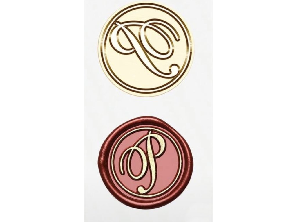 Kovové pečetidlo s písmenem P v psacím stylu.