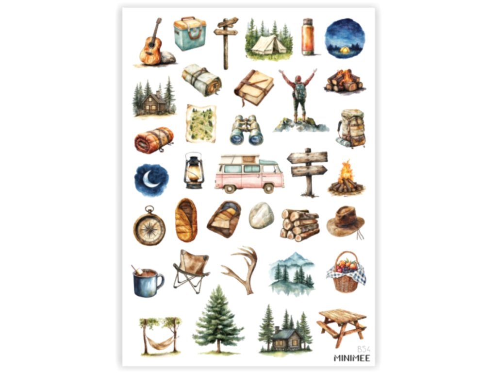 - arch A5 plný samolepek pro milovníky kempování a dobrodružství