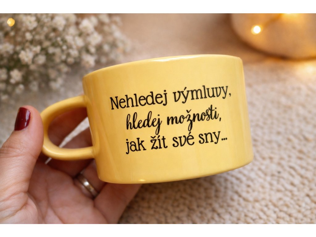 Keramický hrnek s motivačním nápisem je ideální na ranní kávu, čaj i večerní chvilku pro sebe. Jemný žlutý odstín působí hřejivě a optimisticky – jako světlo i ve dnech, kdy je ho méně.