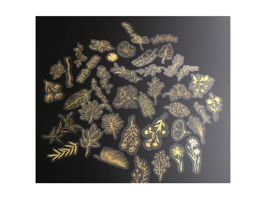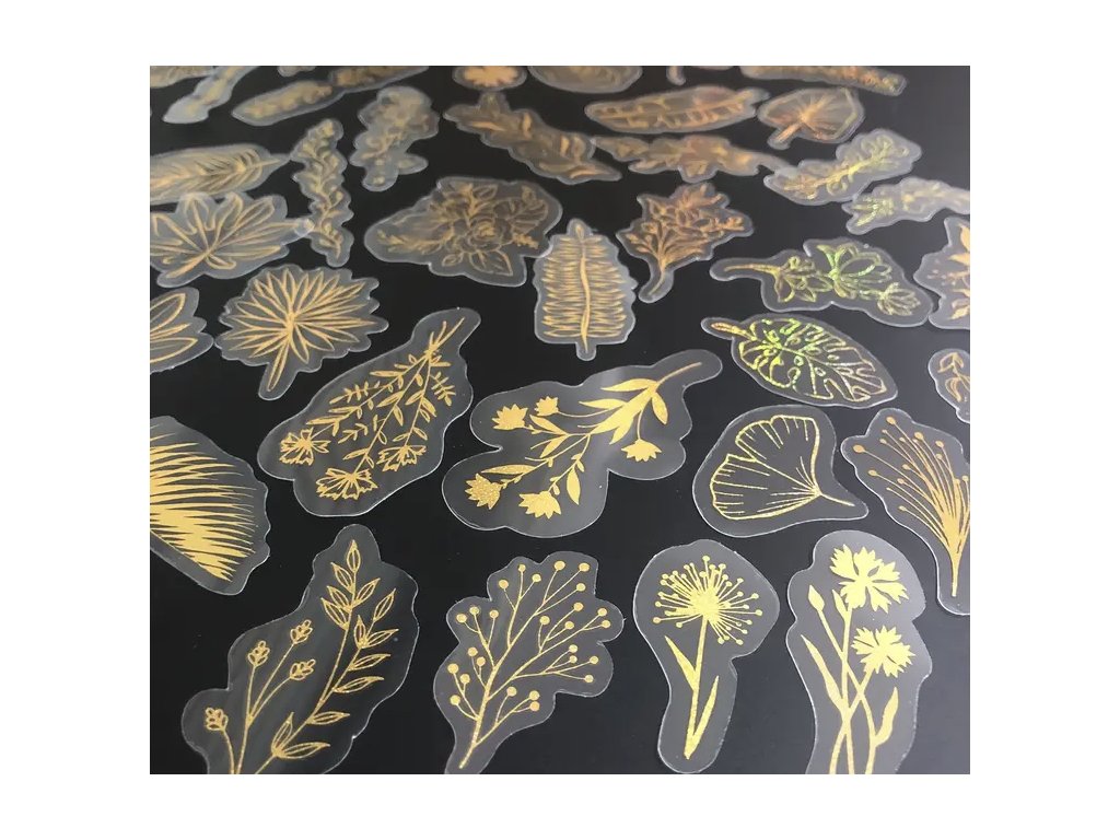 Třpytivé samolepky s motivy listů a rostlin na transparentním podkladu jemně září zlatými odlesky a přidají elegantní dotek každému tvůrčímu projektu.